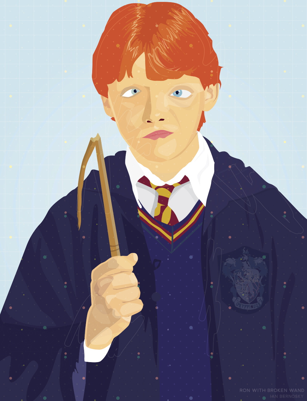 “Ron With Broken Wand” is an illustration that I made of one of Harry Potter’s most beloved characters – Ron Weasley. Below are examples of the illustration presented on a variety of different mediums.