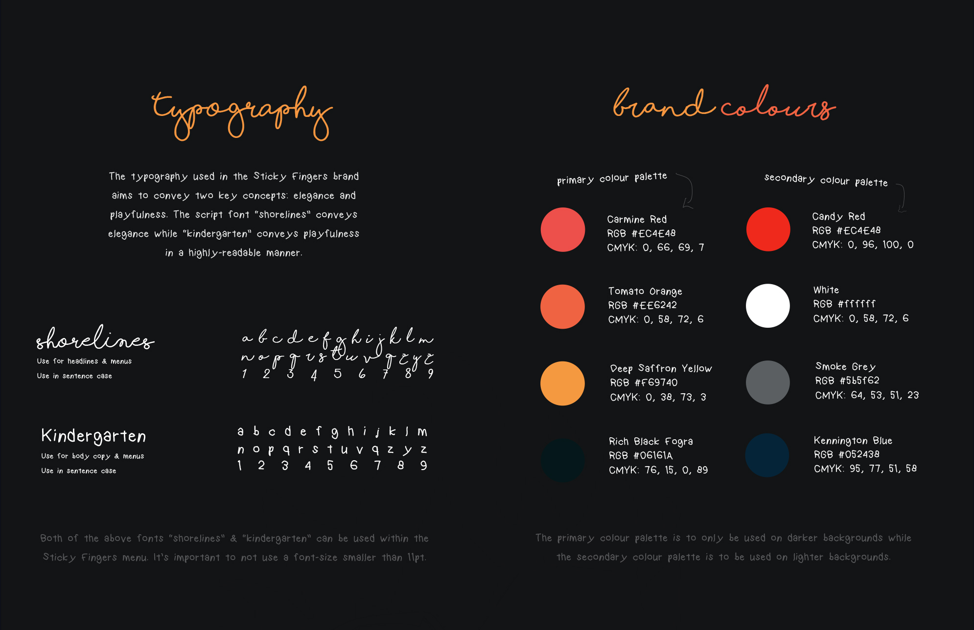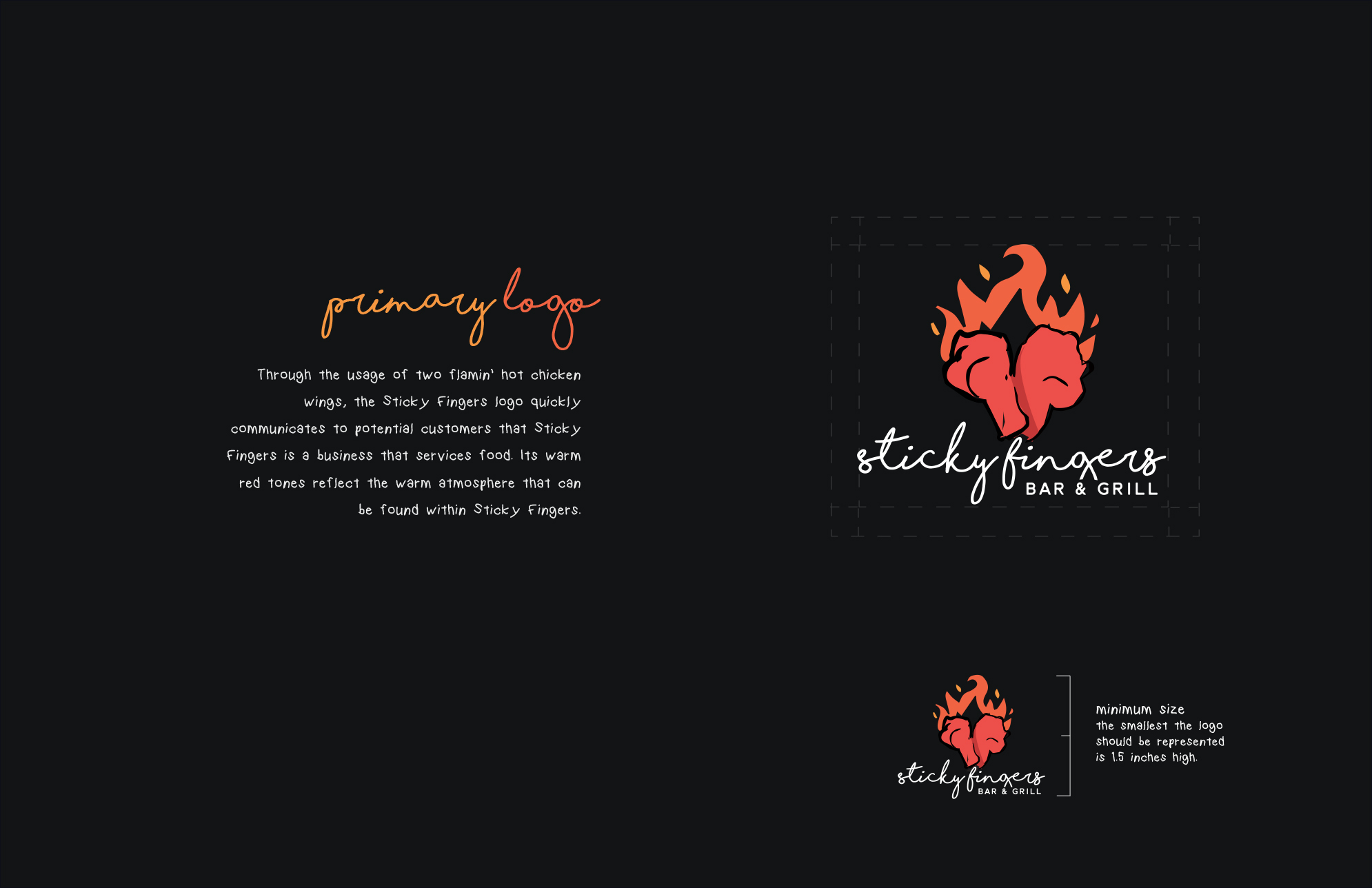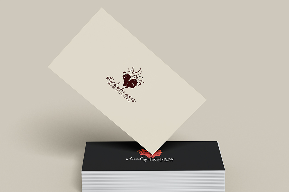 Sticky Fingers was a bar & grill located in Barrie, Ontario. Before shutting down in 2020, Sticky Fingers was locally known for their tasty wings, live music, and amazing customer service. I created this branding style guide to help them elevate their branding to the same high level as their food and service. My brand style guide aims to properly portray Sticky Fingers as a high class bar & grill while utilizing modern, fiery, and hand-drawn visual elements.